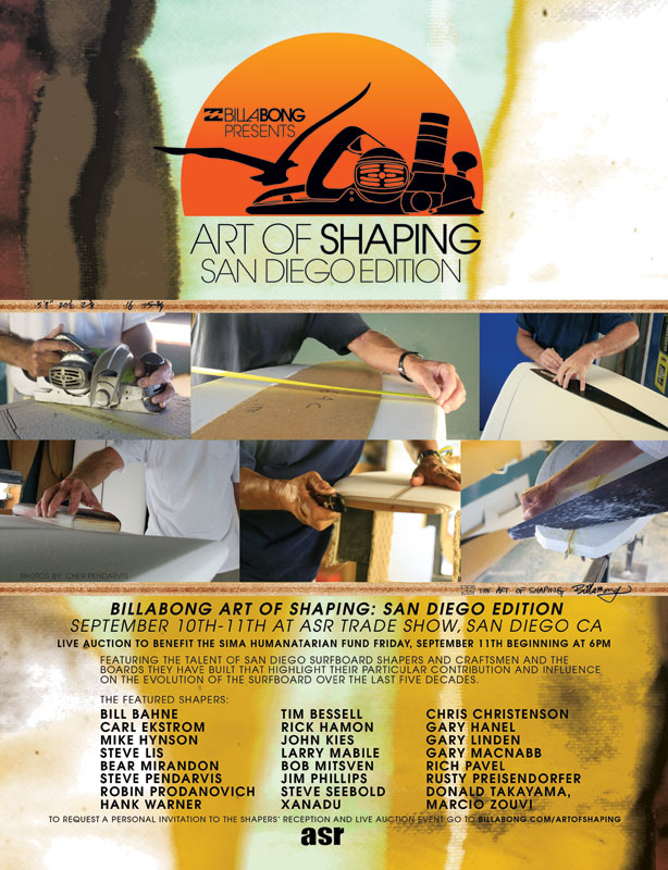 Billabong USA is proud to announce the second annual “Billabong Art of Shaping Event” to be held September 10th-12th at the ASR Action Sports Retailer Trade Show in San Diego CA. This years’ “Billabong Art of Shaping: San Diego Edition” event will feature many of the top shapers from the rich board building heritage of San Diego county. The finalized list of invitees includes Bill Bahne, Tim Bessell, Chris Christenson, Carl Ekstrom, Rick Hamon, Gary Hanel, Mike Hynson, John Kies, Gary Linden, Steve Lis, Larry Mabile, Gary MacNabb, Bob Mitsven, Rich “Toby” Pavel, Steve Pendarvis, Jim Phillips, Rusty Preisendorfer, Robin Prodanovich, Steve Seebold, Donald Takayama, Hank Warner, Xanadu and Marcio Zouvi.