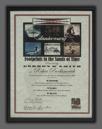 On October 3rd, Gordon and Smith Surfboards celebrated their 50th year of building surfboards in San Diego. G&S was where my shaping career started professionally and I was honored to be presented with this plaque recognizing my shaping contributions to the company from 1973 to 1982. It was a great party!