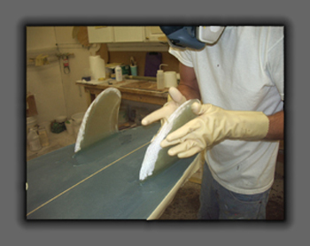 This is David Miller glassing on fins. With removable fin systems so common now, glassing on fins is becoming a dying art.