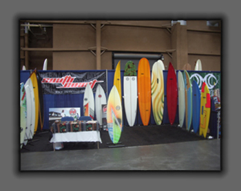 The Sacred Craft Show was bigger and better than ever. The number of people attending was at a record high. Interest in surfboards was keen and legit with everybody’s booth crowded with stoked surfers. This is the South Coast display booth prior to the crush.